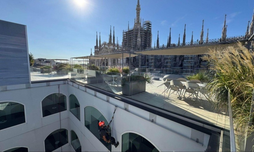 I 45 metri di binari saranno utilizzati come sistema di ancoraggio per le future attività di manutenzione e pulizia delle facciate presenti all'interno del cavedio sottostante non accessibili se non con tecniche di accesso e posizionamento in quota mediante funi.